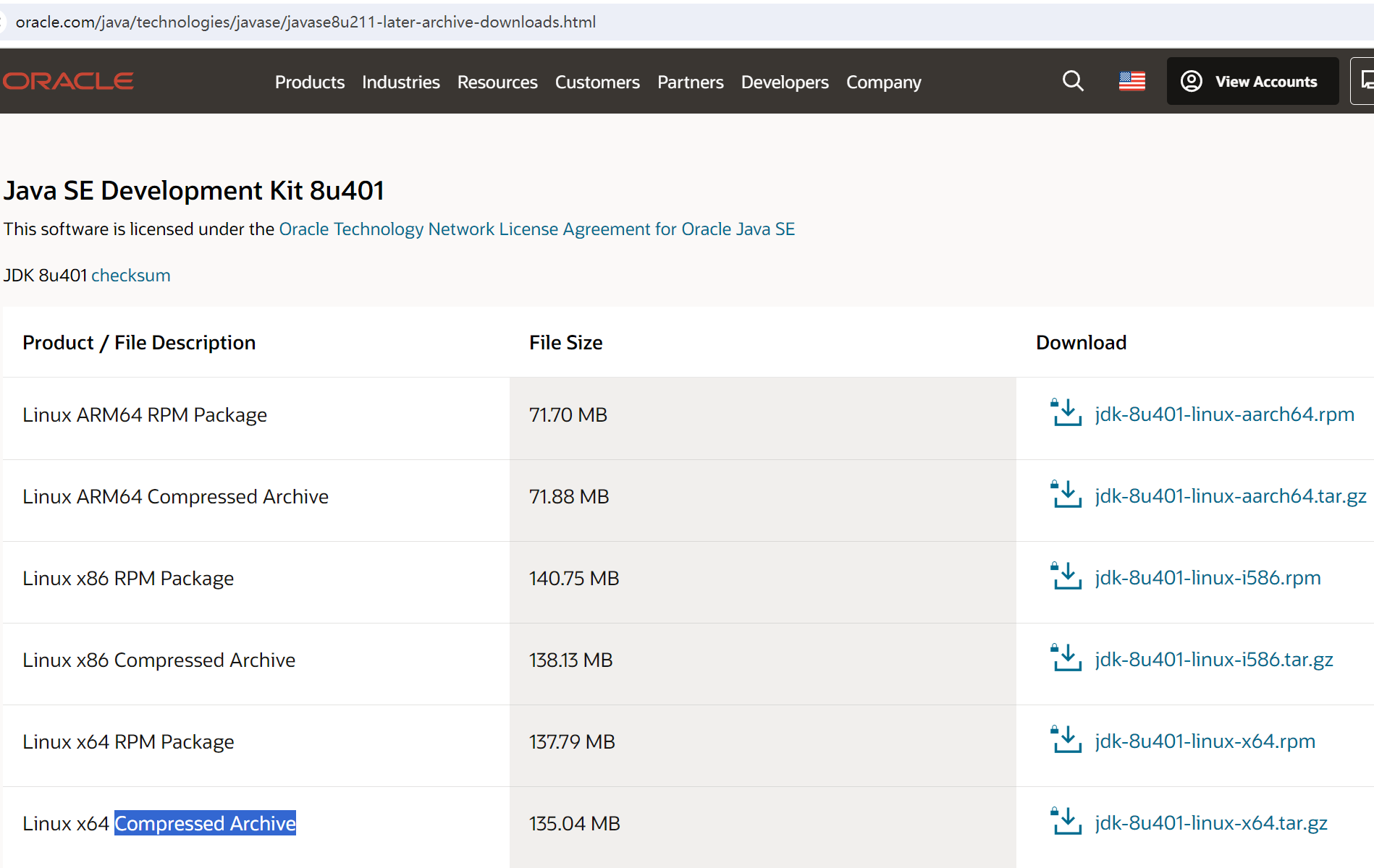 从ORACLE的JDK发布页面,选择Java SE 8 (8u211 and later),按操作系统选择对应的JDK版本进行下载。直接下载Compressed Archive编译包,便于后续版本更新时方便替换。