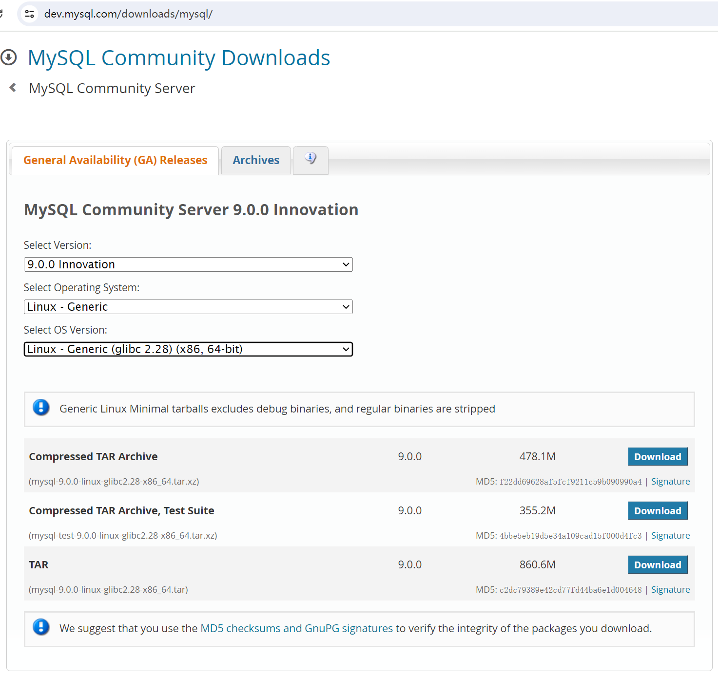 wget -c https://dev.mysql.com/get/Downloads/MySQL-9.0/mysql-9.0.0-linux-glibc2.28-x86_64.tar.xz