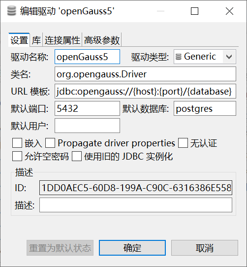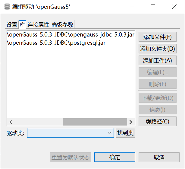 在官方网站下载jdbc驱动,在驱动库中引入opengauss-jdbc-xxx.jar和postgresql.jar文件,之后在dbeaver中新增Generic类型的驱动模板使用即可。