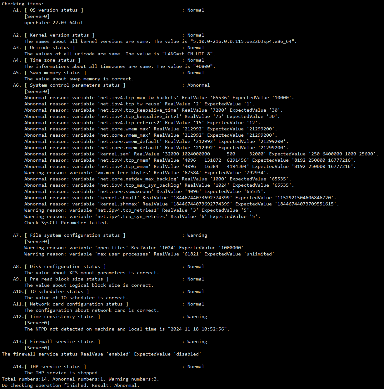 检查结果如果为“Warning”,请对照官方文档进行核实各项配置,确认是否需要调整。检查结果如果为“Abnormal”,应按官方文档说明进行调整后再进行部署。