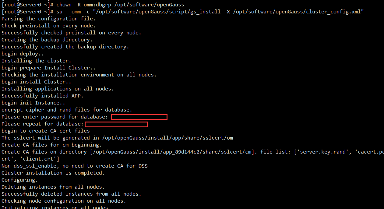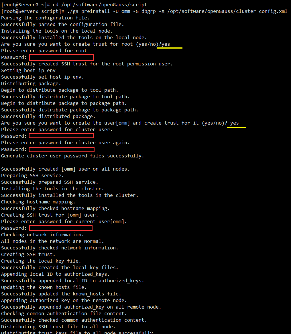 执行过程中写入操作系统的root用户及新建omm用户的密码。等待脚本执行完成即可。